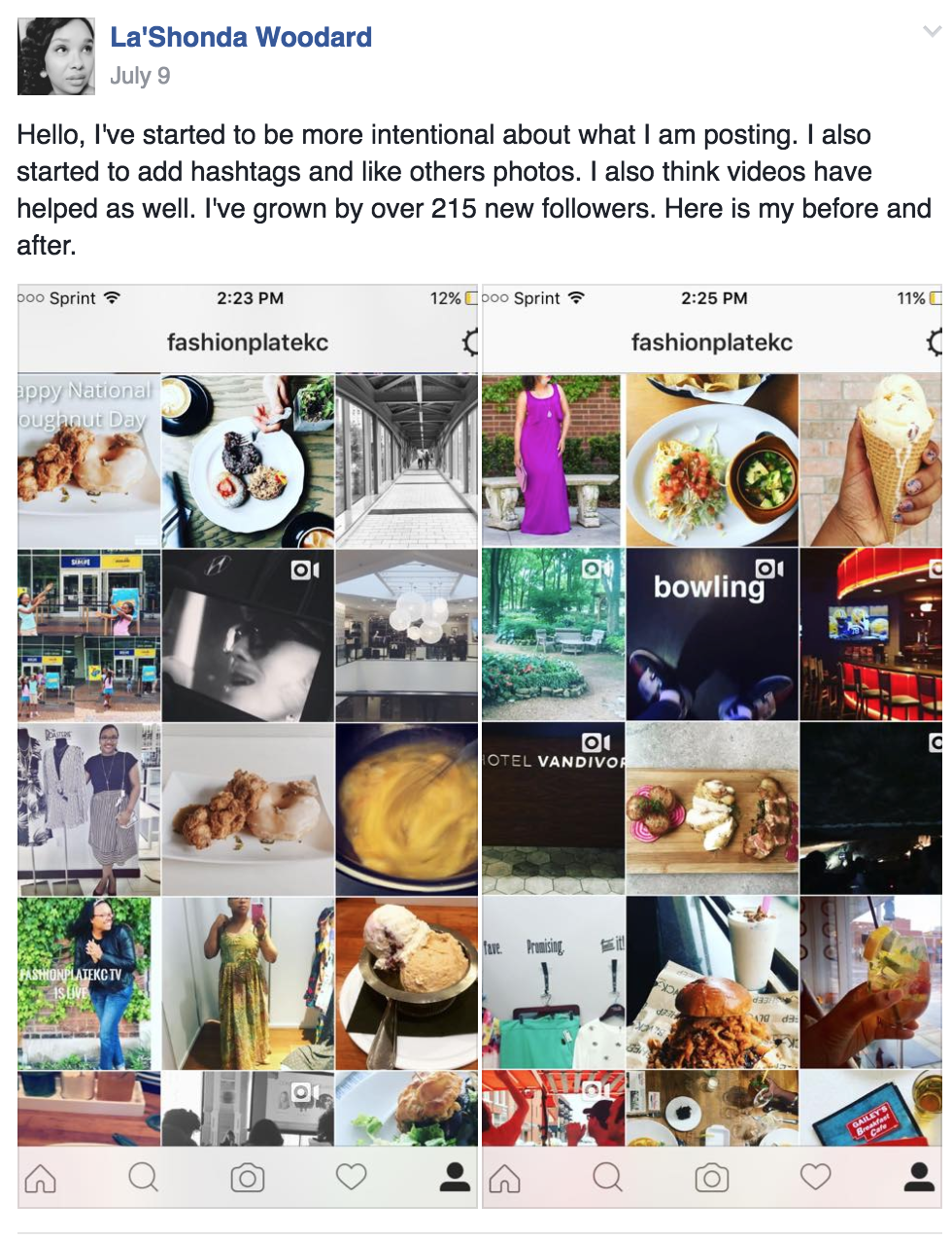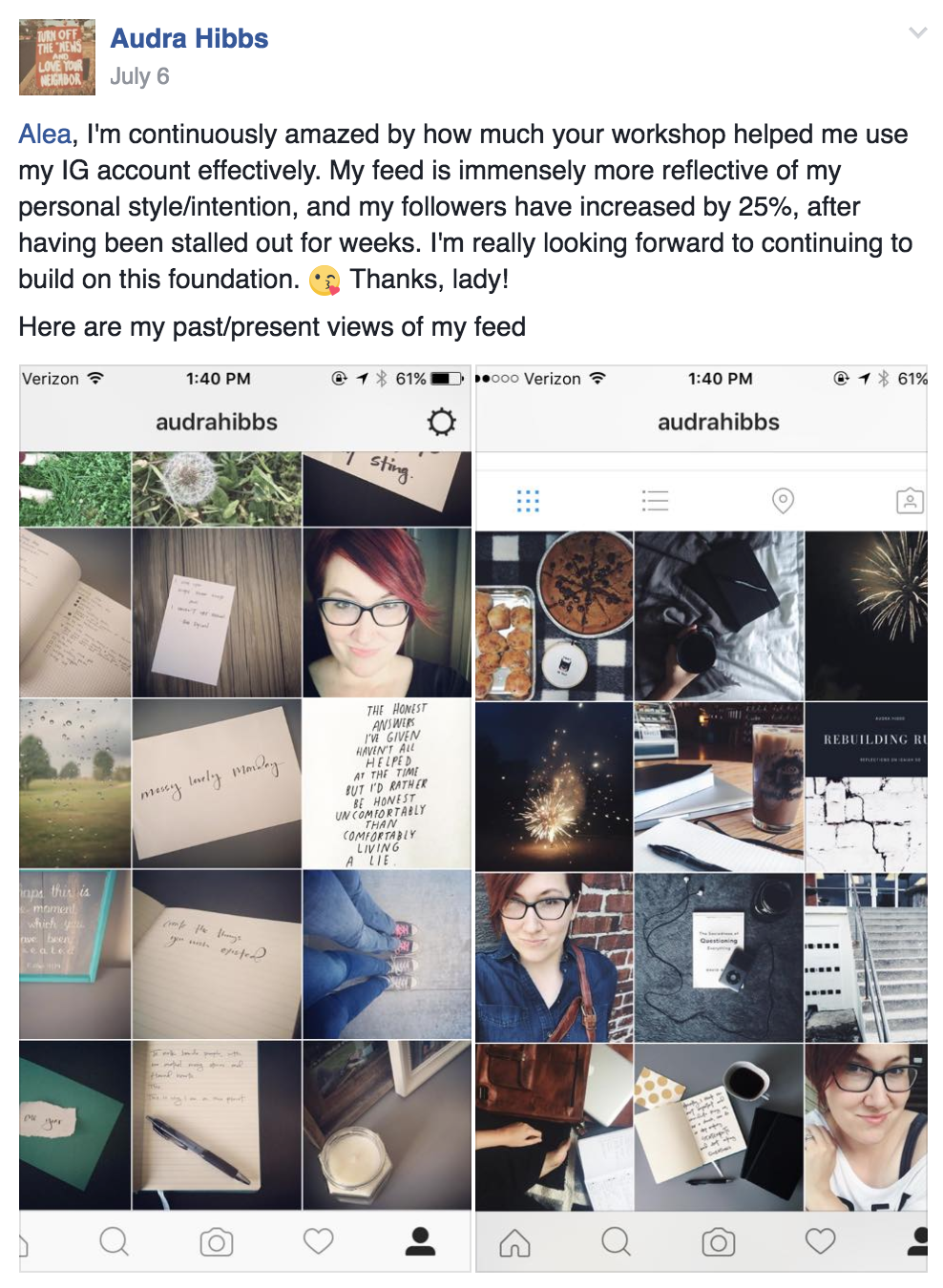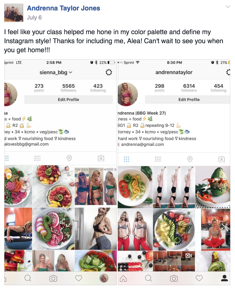 After. Training session about how Instagram works, how to take better pictures with her phone and edit to make a cohesive and attractive feed that will appeal more to the demographic she was trying to attract.